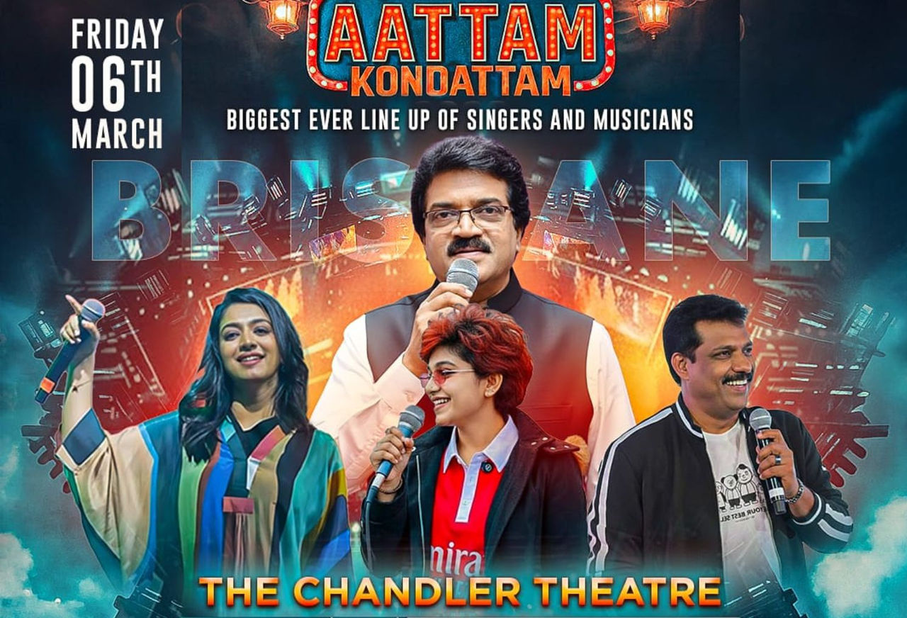 Aattam Kondattam 2026 – The Grand Musical Celebration! Get ready for an unforgettable evening of music and entertainment as the legendary MG Sreekumar leads a star-studded lineup of singers and musicians at The Chandler Theatre, Brisbane, on Friday, March 6. Presented by Brisbane Stars Club Inc., this vibrant musical event promises a night filled with energy, rhythm, and pure joy for music lovers of all ages!